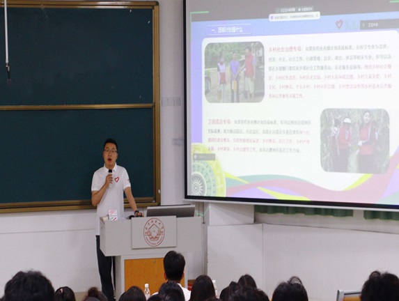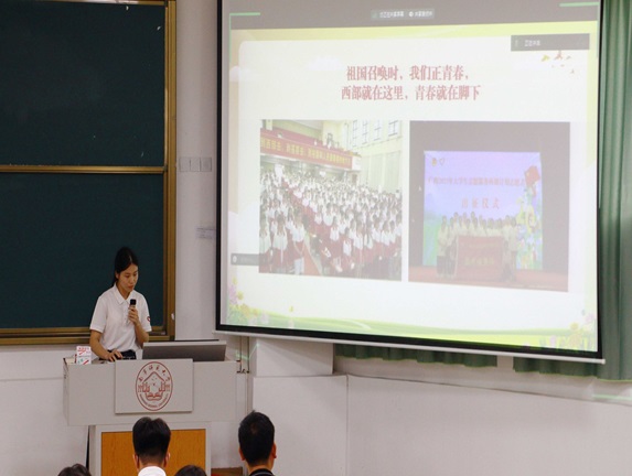 西部计划广西项目办项目专员陈钲元围绕西部计划的重大意义、实施情况、工作内容、政策保障几个方面展开阐述,详细介绍了参加西部计划的要求、报名方式、流程以及服务期满后的优惠政策,让在场的同学们对西部计划有了更加全面和深入的了解。