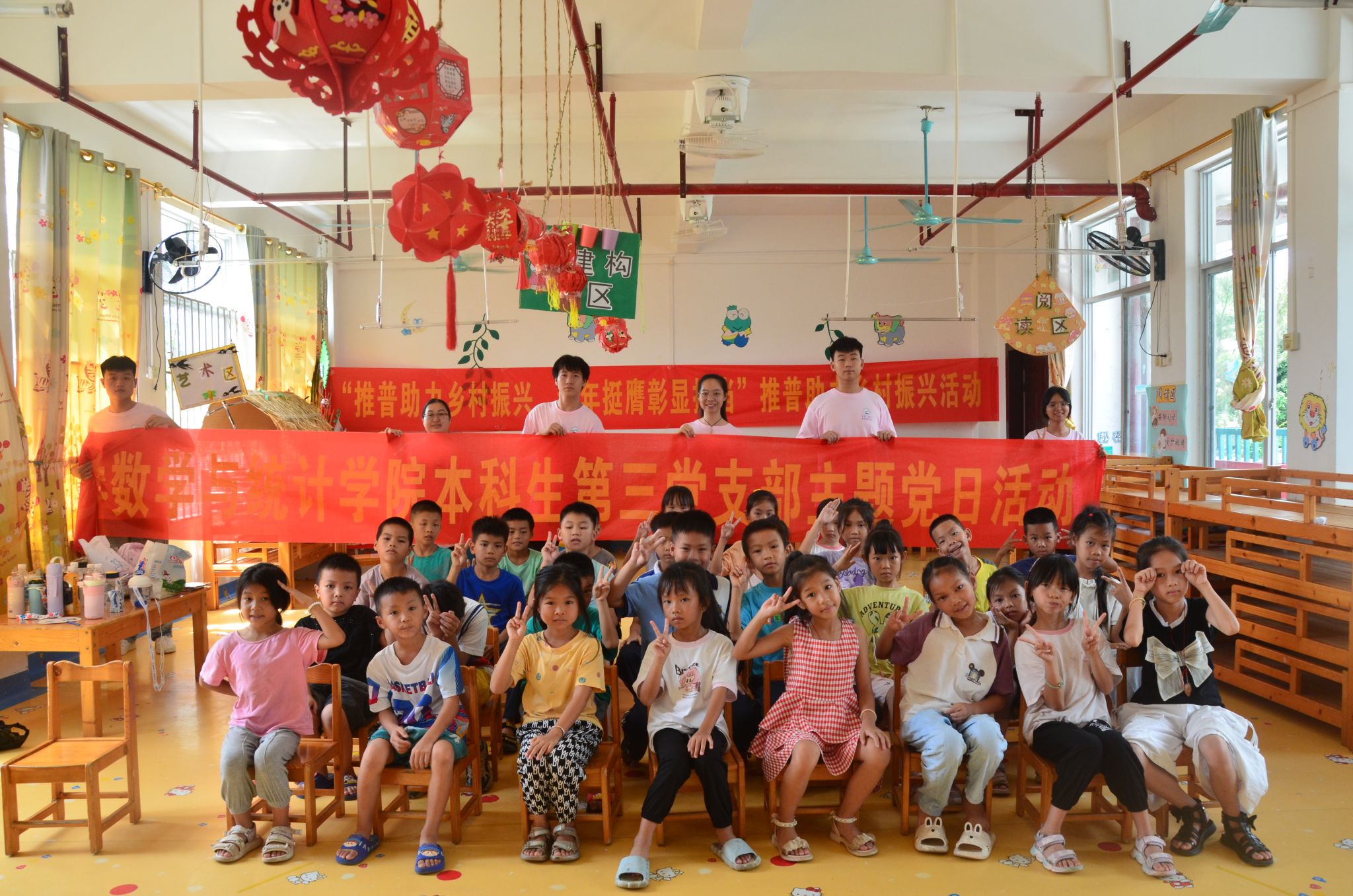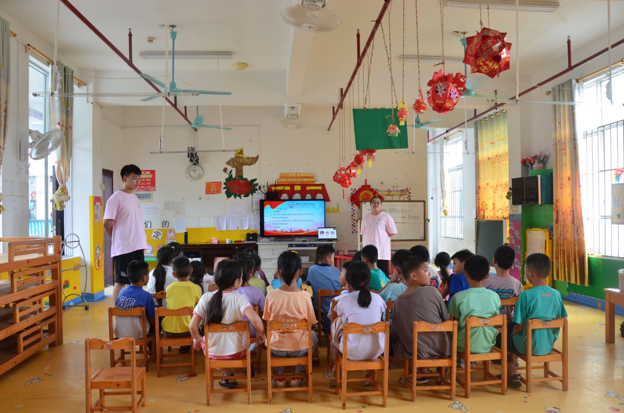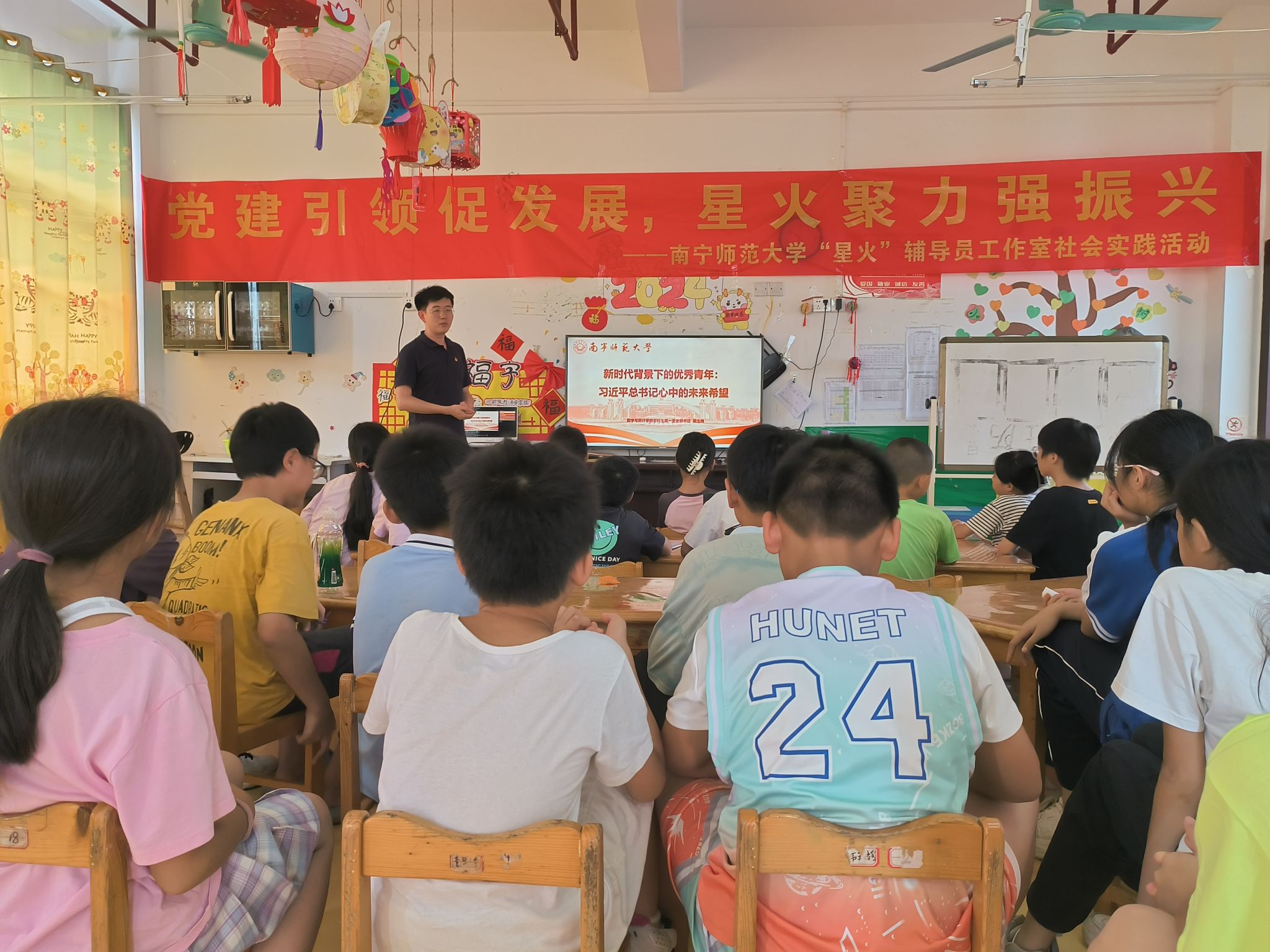 为深入学习贯彻党的二十大精神以及习近平总书记关于青年工作的重要思想,传承红色基因,在孩子们心中播下“红色种子”,7月11日上午,数学与统计学院2024年大学生暑期“三下乡”社会实践活动“澎湃·朋π”实践服务队在南宁市武鸣区马头镇中心幼儿园开展了以“时代殷殷嘱托,青春砥砺前行”为题的理论宣讲活动。本次活动邀请了学院本科生第三党支部书记、暑期“三下乡”带队老师梁卡霖和本科生第一党支部书记第生辉老师担任宣讲人。