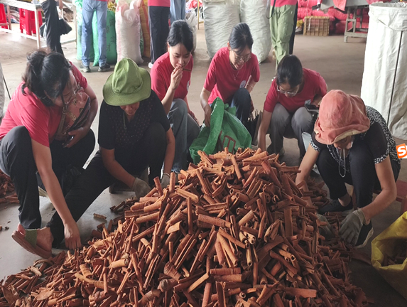 观看完宣传片后,扶隆镇政府工作人员带领实践团队一同前往防城港市世杰香料有限公司进行调研。在工厂,大家观摩了八角与桂皮的分拣、晾晒、加工、运输、销售等一系列严谨有序的流程,在工作人员耐心且细致入微地介绍下,大家不仅学会了如何准确辨别肉桂八角的品质优劣,还调研了香料行业供应链的全产业链细节与数据等。