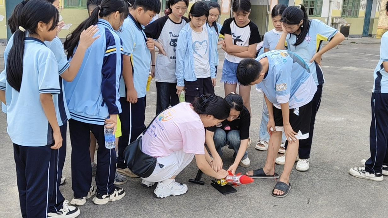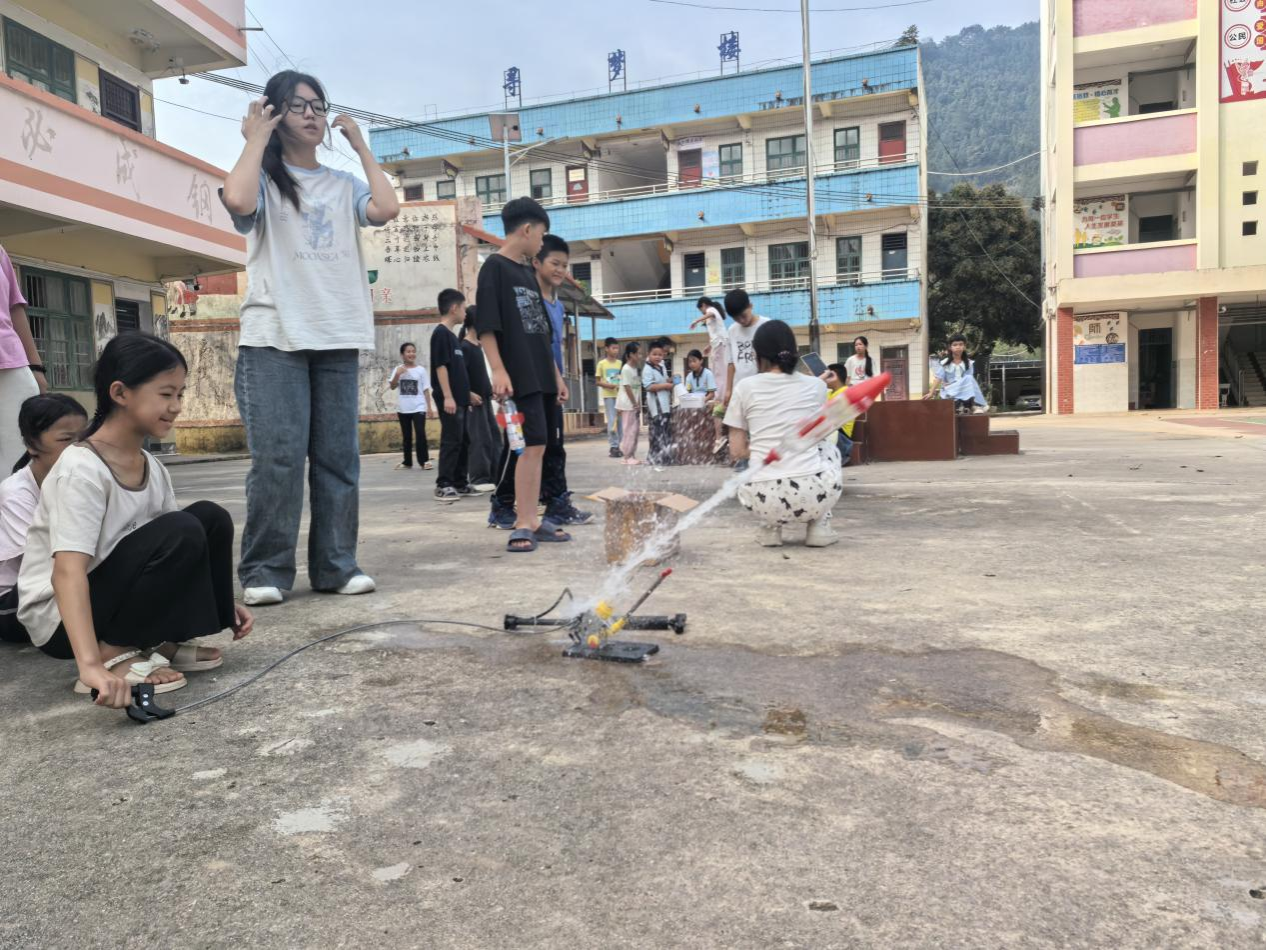 为丰富小学生的科学体验,队员们特别开展了水火箭科学探索课堂。队员通过科普视频展示水火箭原理、装置及组装过程,引导小学生从数理角度探科学奥秘。在安全指导下,小学生们进行发射实验:有的打气保气压,有的按按钮发射,水火箭冲天声不断。看着自己的水火箭上天,他们笑容满面、欢呼雀跃,分享喜悦。在此过程中,小学生们学到科学知识,提高动手能力,体会到科学乐趣。