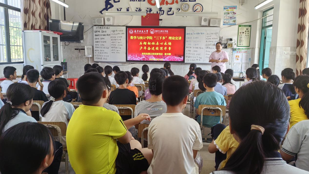 数统学院团委书记梁卡霖和团委副书记(学生)方焦阳分别以“石榴相依赤心永驻,少年奋进续写华章”和”强军强国,厚植家国情怀“为题开展理论宣讲活动。理论宣讲通过红色教育,鼓励那楠乡孩子珍惜学习机会,担当传承民族文化、促进民族团结的重任,如石榴籽般紧密相拥,为祖国发展贡献力量,实现 “石榴永红,青春接力”。