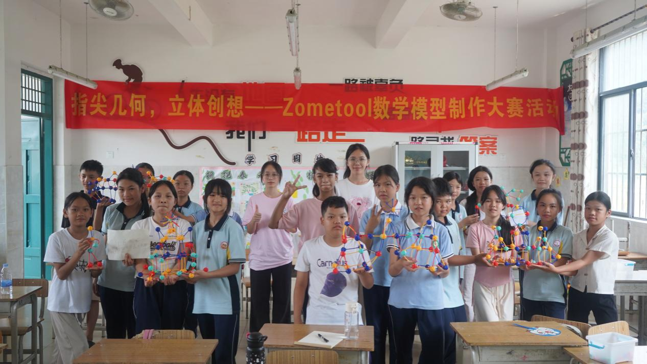 “指尖几何,立体创想——Zometool数学模型制作大赛”上,队员用Zometool套件和动画演示立体几何,引导小学生从积木、蜂巢联想几何结构。分组合作中,小学生们搭建对称金字塔、复杂多面体,队员启发创新。课堂频现“数学真有趣”的感叹,小学生们在实践中感受几何之美,燃起对数学的热爱。