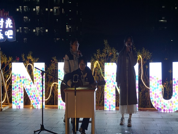 11月22日晚,由校团委主办,马克思主义学院、化学与材料学院和环境与生命科学学院联合承办的“周末好时光·一起音乐吧”第七期美育实践课堂分别在五合校区足球场、武鸣校区实验楼湖畔广场同期温情开演。